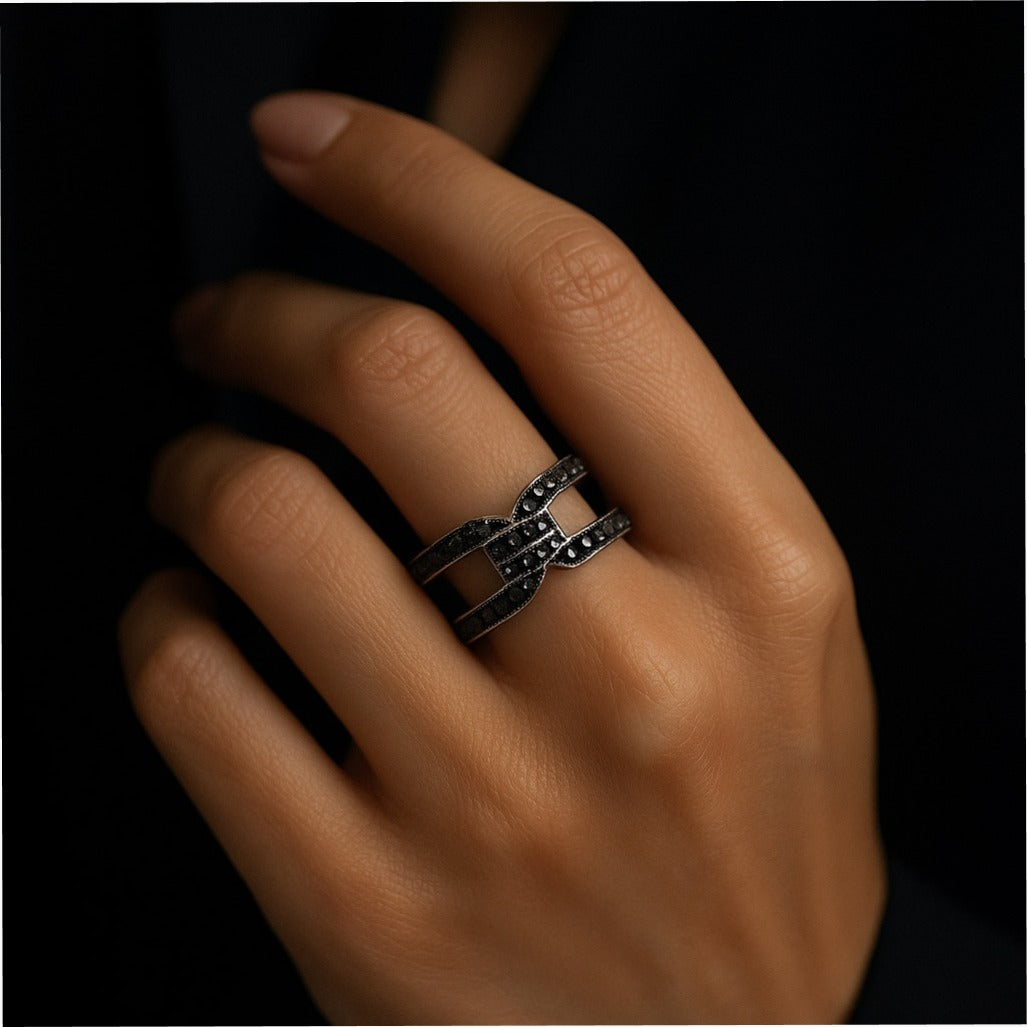 Statement ring with bold black moissanite dimond and modern geometric design.