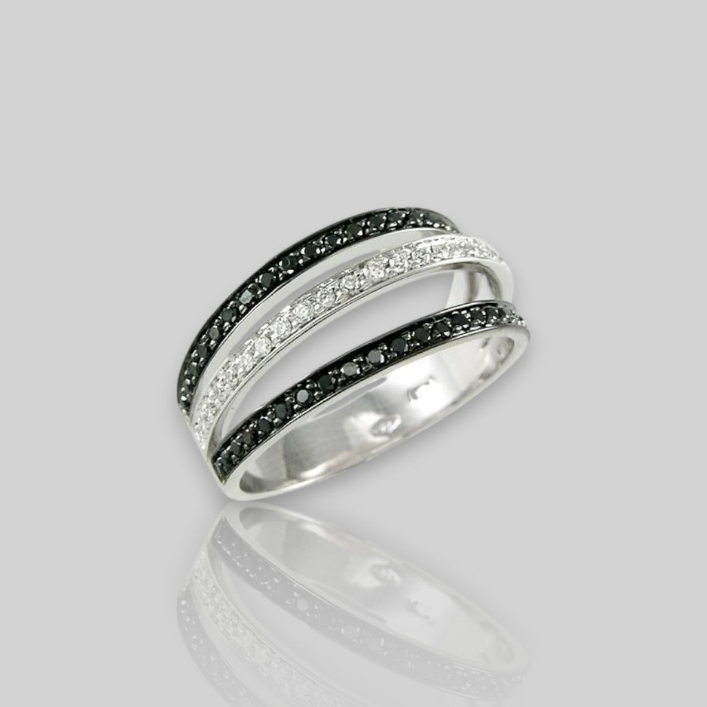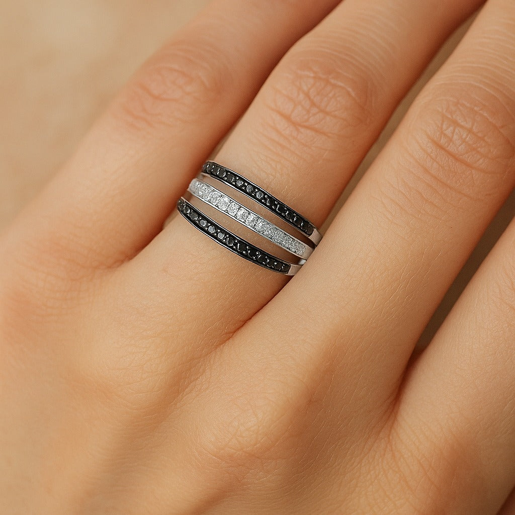 Sleek triple-band ring featuring black and white diamonds in a modern silver setting.